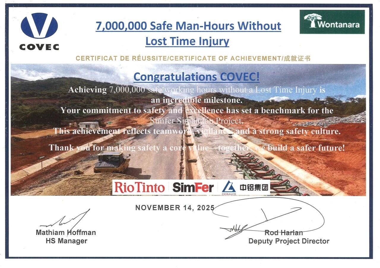 当地时间11月29日,中国海外在几内亚力拓西芒杜矿区荣获“700万安全工时”表彰证书,成为矿区内第一家达成此项安全里程碑的承包商。